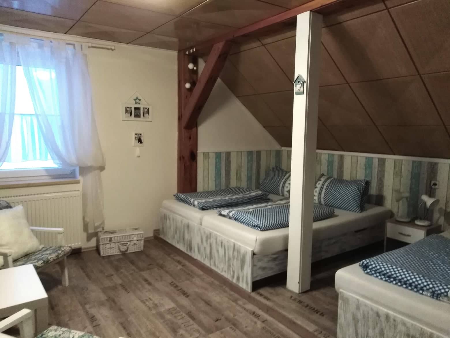Modrý pokoj je čtyřlůžkový, velmi útulný pokoj s posezením.
