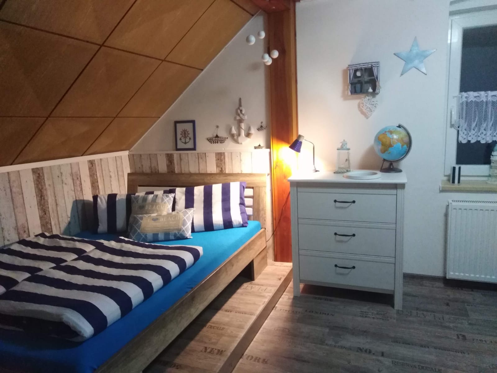 Námořnický pokoj je nejmenším, ale zároveň nejútulnějším pokojem, který je pro dvě osoby.